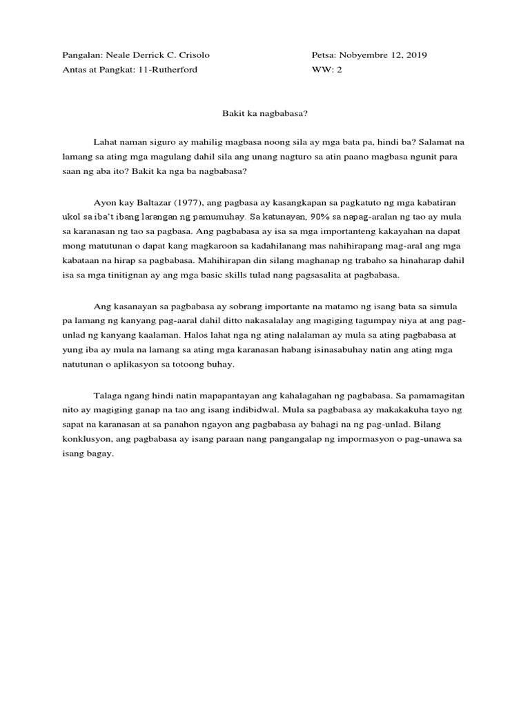 Bakit mahalaga ang pagbabasa. Unit 11 psychological perspectives essay.